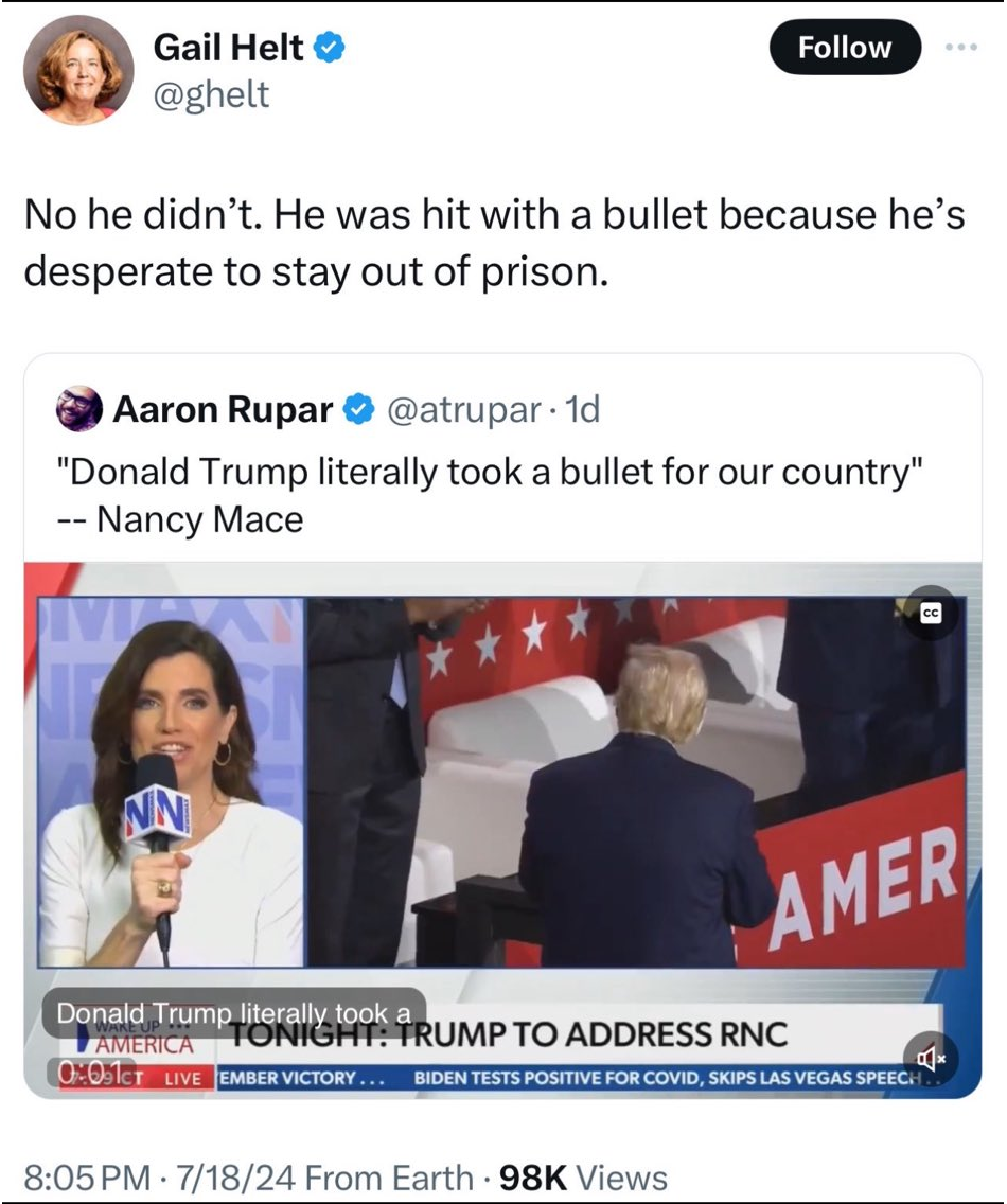 When someone said that Trump took a bullet for his country, Helt retorted that he was shot because he was desperate to stay out of prison. Suggesting that Trump orchestrated this whole thing.