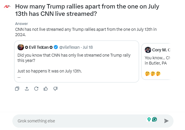 Just to have fun, I asked Grok, the X platform AI a simple question - "How many Trump rallies apart from the one on July 13th has CNN live streamed?"