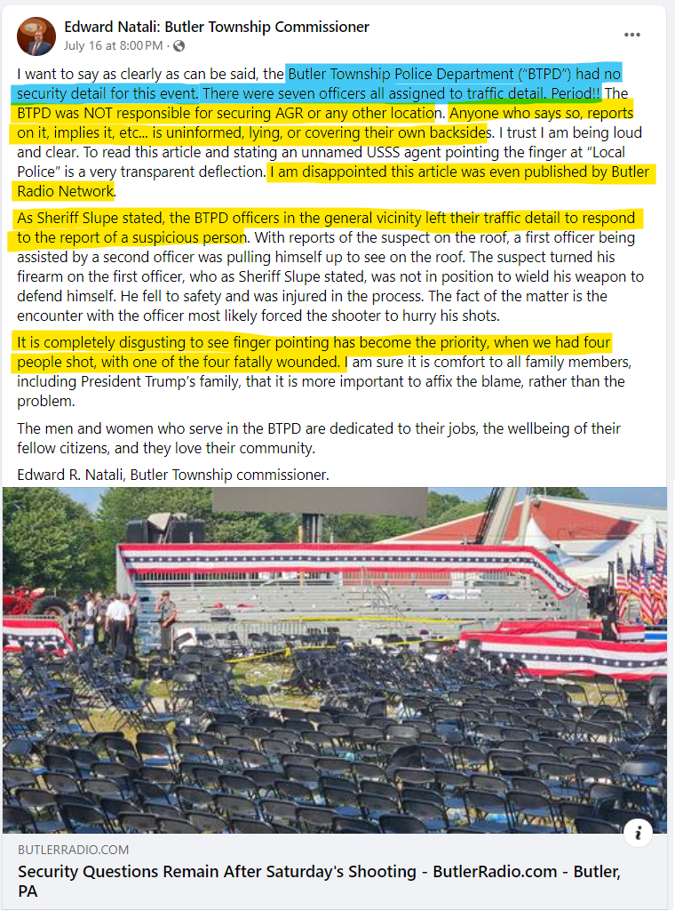 That statement would have been the end of the story in normal circumstances. but the Butler Township Commissioner came out with a Facebook post of his own to set the record straight.