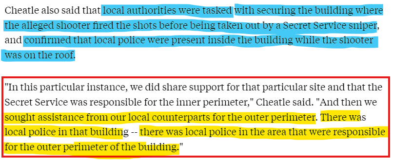 Per her assertion, local police was tasked to secure the building which was used by the shooter to target Trump.