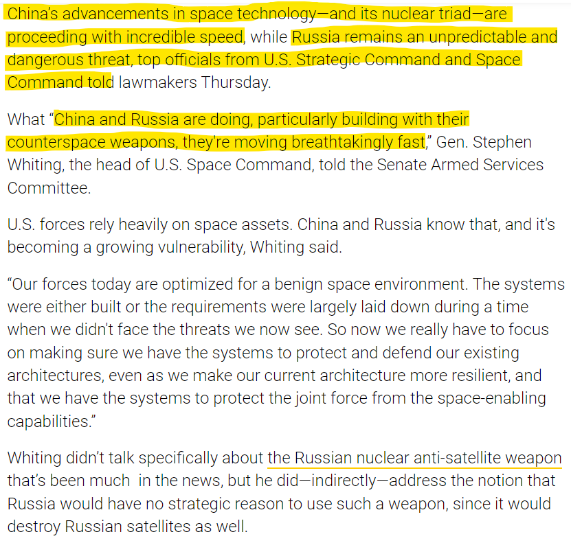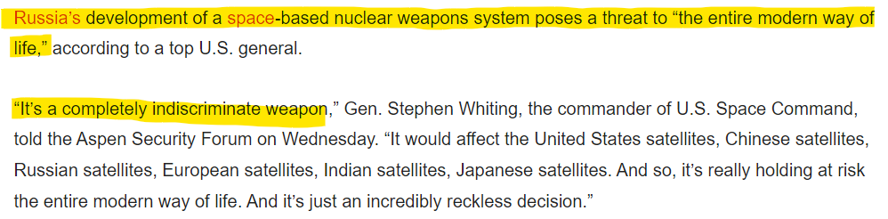 Recently, Gen. Stephen Whiting, the commander of U.S. Space Command, told the Aspen Security Forum that Russia was developing space-based nuclear weapons.
