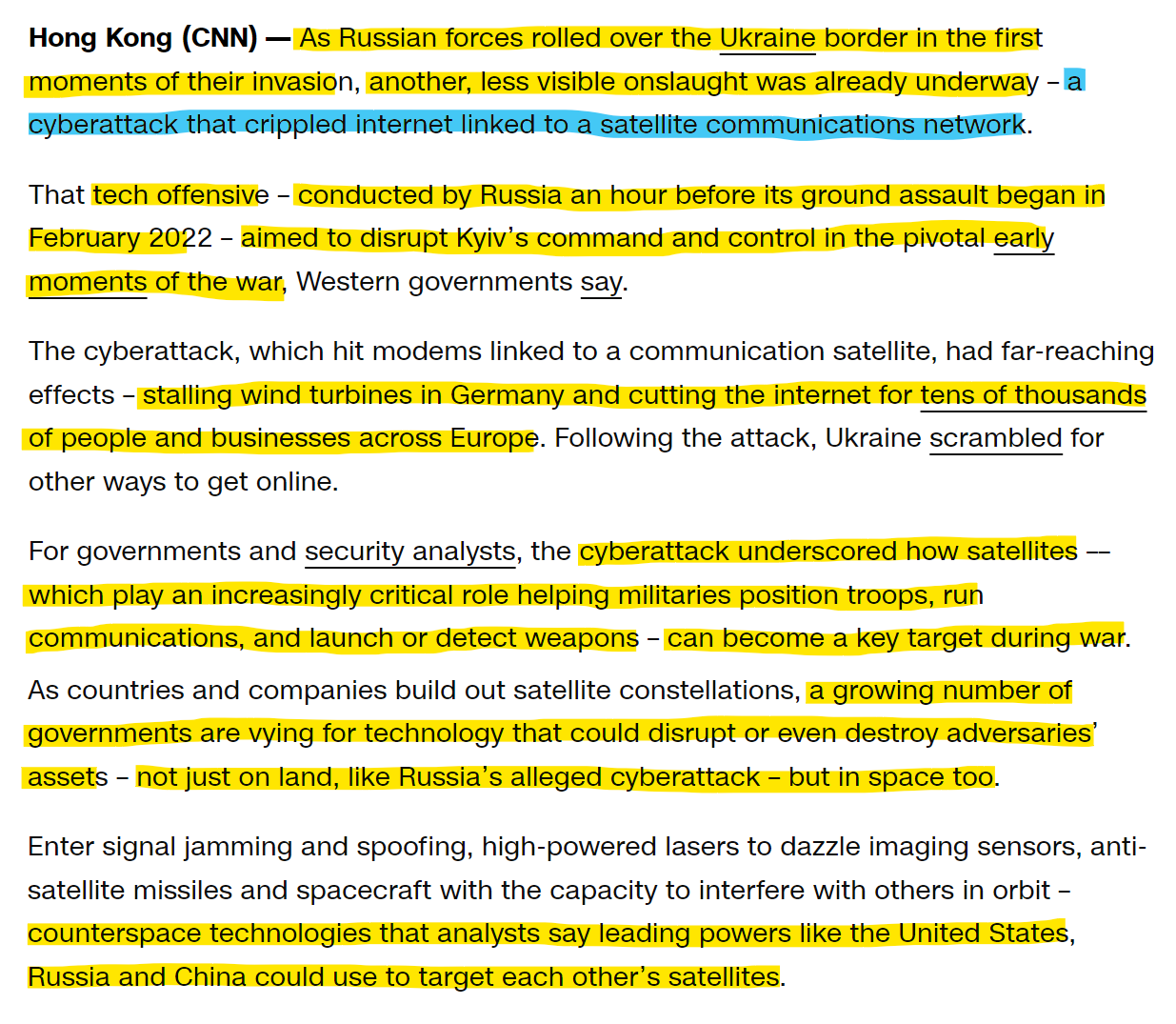 So when you look at cyberattacks and the vulnerabilities that the Crowdstrike outage demonstrated, one needs to remember that a test-run of space-originating cyber outage as a precursor to the launching of a war has already been done!