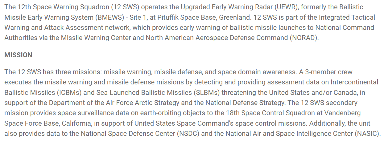 Pituffik Space Base, formerly known as Thule Air Base, became part of Air Force Space Command in 1982. As of 2025, the base is home to the 821st Space Base Group, which is responsible for base support within the Pituffik Defense Area. The 12th Space Warning Squadron, a critical component of the base, operates a Ballistic Missile Early Warning Site designed to detect and track ICBMs targeting North America. This vital missile warning and space surveillance data is transmitted to NORAD command centers at Peterson Space Force Base in Colorado.