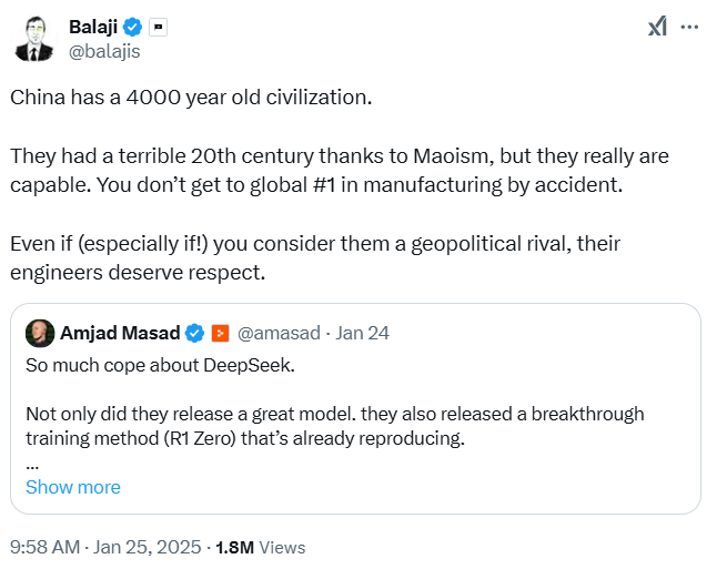 When you see headlines like the ones we saw after DeepSeek was launched, you know that China is no longer just making cheap and lower-end stuff. It is in the race to the top and targeting top of the line sophisticated technologies. At a fraction of the cost that their Western counterparts have been able to create.