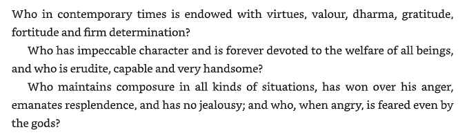 The Shlokas (verses) which share the questions from Valmiki are the following in Ramayana in Sanskrit. Unfortunately, their translation is done in the normal secular and modern way without full base in spirituality. We will look at the meaning of some of the words again.