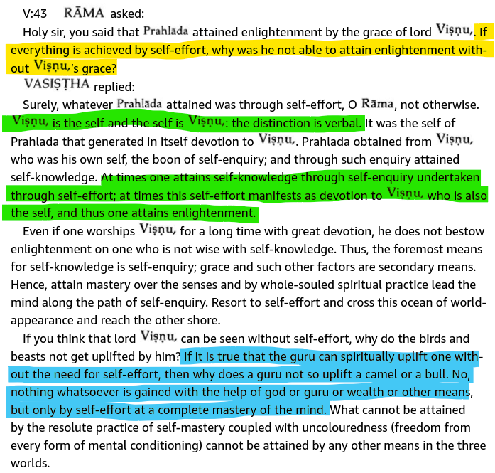 This was shared by Sage Vashishta when had shared how Prahalad got enlightenment by the "grace of Vishnu" after extolling the criticality of Self-effort for a spiritual seeker.