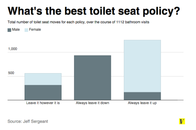 Why would there be opposite view points on the position of the seats from the genders? I would venture to guess that Men may assume that they would do a woman some good by leaving the seat in a position where she doesn’t have to do much. Whereas women, knowing men for what they are – hurried leakers gifted with a general sprinkler as opposed to a sharp nozzle to target it just right – want to keep exactly where it should be for such a sprinkler!