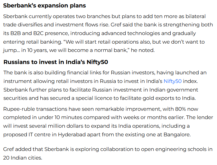Alternative payment rails to the Western system. Sberbank is heavily sanctioned; its use of rupee–ruble settlements and local banking infrastructure in India provides Russia with a semi‑insulated channel for trade in oil, commodities and possibly gold, outside SWIFT and major Western banks. That fits the wider Russian (and BRICS) agenda of building non‑dollar, non‑Western financial corridors.