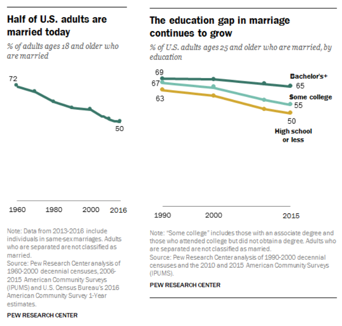 Half of the US adults are married today as opposed to 72% in 1960. And interestingly the level of education has a direct correlation to the sustenance of marriage.