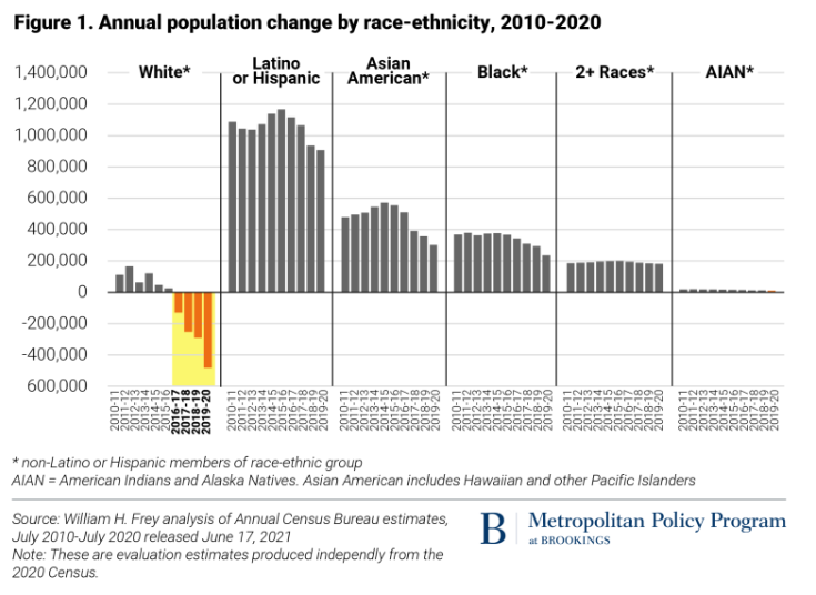 As Figure 1 shows, annual white population losses over the four years between 2016-17 and 2019-20 were 129,000; 252,000; 290,000; and 482,000. Together, this loss of more than 1 million white people outweighs the white population gains of the decade’s six earlier years, leading to a likely first-ever decade decline of the nation’s white population when the final 2020 census results are tallied. In contrast, nonwhite race and ethnic groups increased in size over each year of the decade, and were responsible for all of the nation’s population growth between 2016 and 2020. Latino or Hispanic Americans led all groups, with annual gains at or approaching 1 million a year. Asian Americans added between 300,000 to over 500,000 to their population each year, followed by Black Americans, persons identifying as two or more races, and American Indians and Alaska Natives. (Source: All recent US population growth comes from people of color, new census estimates show / Brookings Institute)
