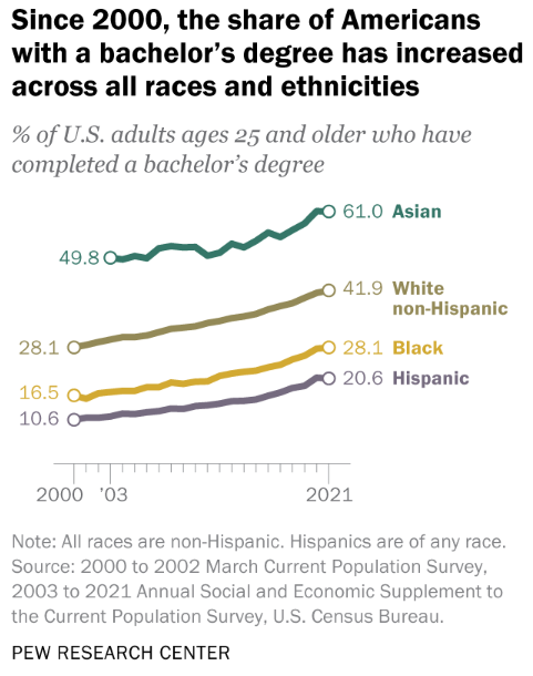 In the larger US population, the ethnicity-wise breakdown of the Americans with a bachelor's degree is quite instructive. The percentage of Asians (which includes Indian-Americans) with a bachelor's degree is 3 times that of the Hispanics.