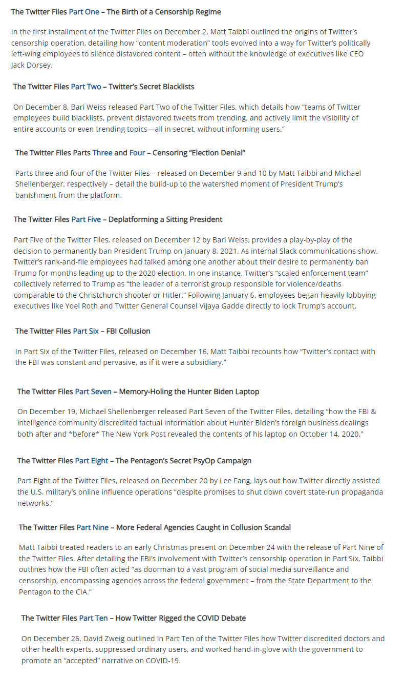 Here is an excellent summary of what these Twitter Files shared. You can see a progression of how comprehensively and hopelessly one party (Democratic), the FBI, and the technology social media companies were sabotaging American democracy and polity.