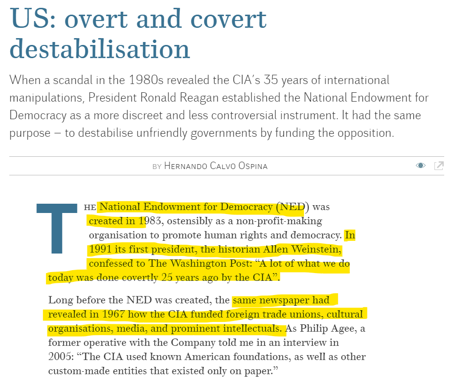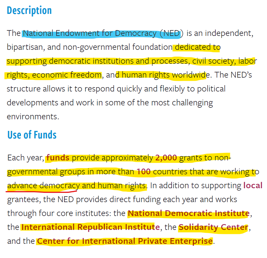 National Endowment for Democracy was meant to do - along with USAID - what the CIA used to do earlier - by funding foreign trade unions, cultural organizations, media, and intellectuals. Now they do it via NED by funding trade unions and business corporations. Of course, NED has it covered both ways in a partisan political system by funding the Republicans and Democrats.
