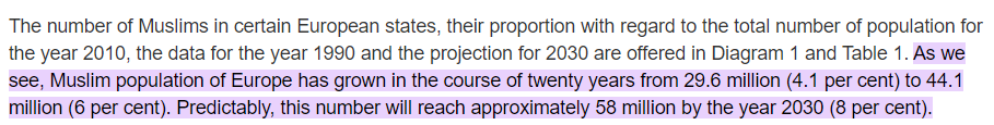 For example, the Muslim population in Europe is increasing at a rapid pace. By 2030, it will be 8% of the total population in the European countries.