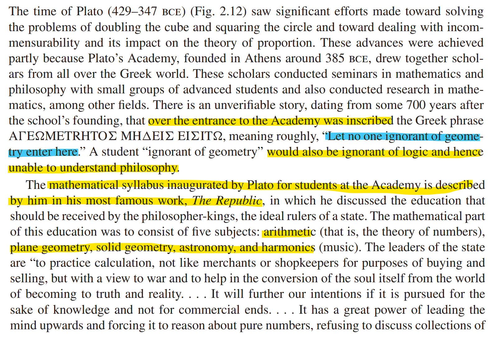Its other great members at various times included greats like Aristotle, Heraclides, Eudoxus, Philip of Opus, and Crantor. There was a time when the entrance of the Academy had the words "Let no one ignorant of geometry enter here" inscribed there.