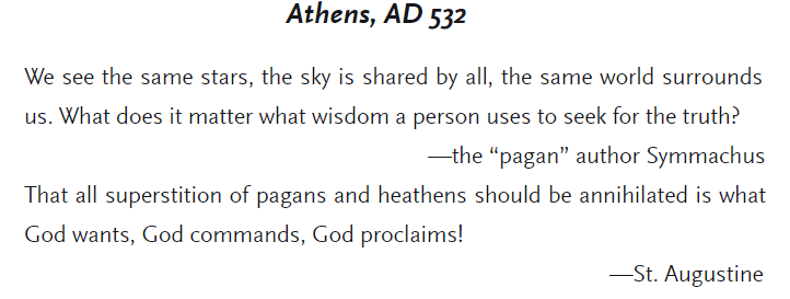 Here are two quotes from two people, known in their own groups, as exemplary. (Source: "The Darkening Age: The Christian Destruction of the Classical World" by Catherine Nixey)