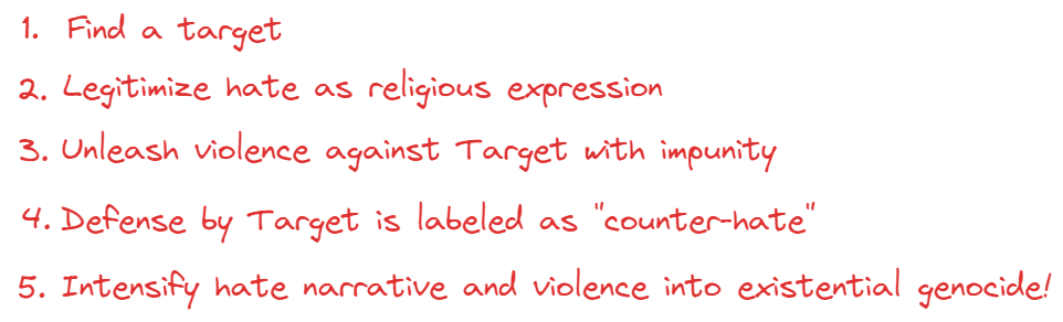 The journey to genocide is paved by the use of legitimized and normalized hate. Once you are established as one to be hated, violence against you and your consequent destruction becomes a noble act.