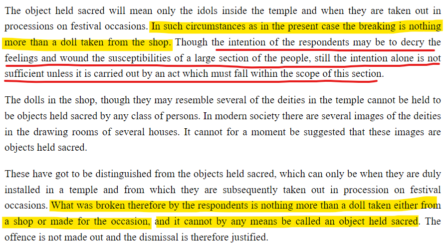 The Madras High Court bench of Justice Somasundaram held that the Ganesha murti was no more than a "doll"! Even though Ramaswamy Naicker 's aim was to insult the religious feelings of the Hindus, but the act was not within the IPC Section because, the judge decided, the murti was not sacred since it was no more than a doll!