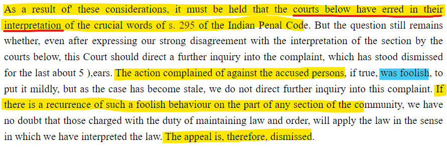When the appeal was taken to the Supreme Court against the interpretation of the Madras High Court, the Supreme Court judged that the High Court's interpretation of Section 295 was faulty. Yet, it dismissed the plea because the "action of the ... accused.. was foolish" and that action should be taken "if there is a recurrence of such a foolish behavior."