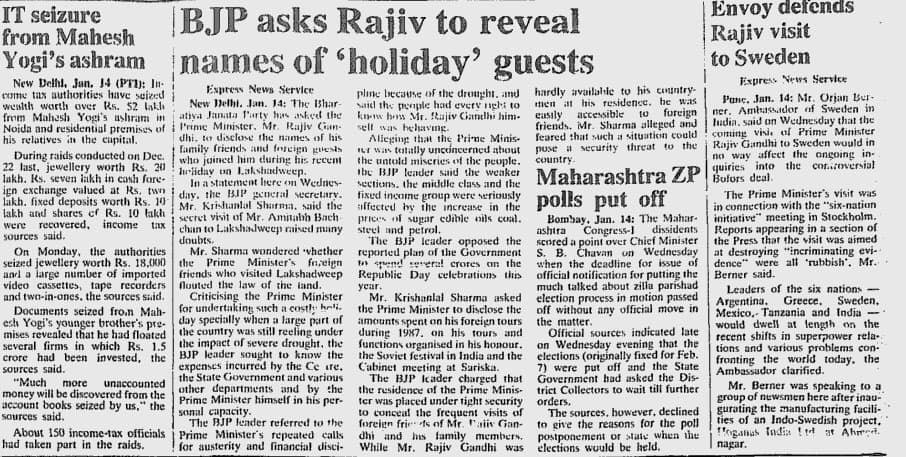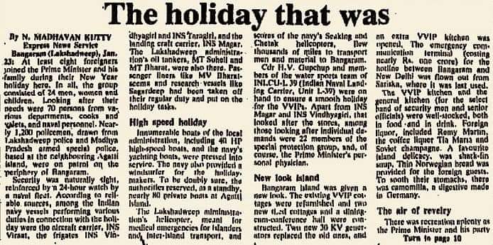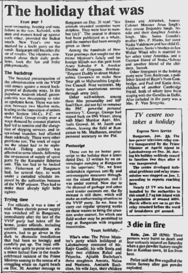 In a report dated January 31, 1988, Anita Prathap wrote about how the then PM Rajiv Gandhi, his wife Sonia Gandhi and their family and friends enjoyed a holiday in an uninhabited island in Lakshwadeep. People in that entourage included: