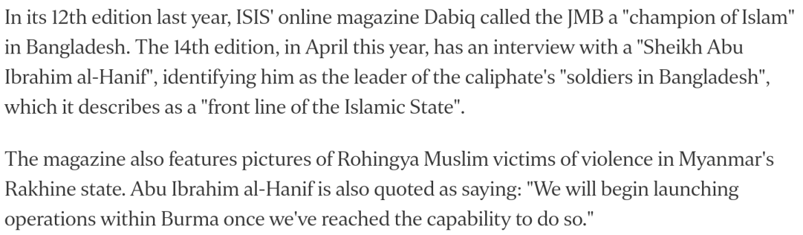 The addition of Rakhine area within Myanmar to the islamic Greater Bangladesh plan is also very interesting. Rohingyas are in alliance with JMB and Harkat-ul-Mujahideen, and as per the ISIS magazine, also part of their larger group.