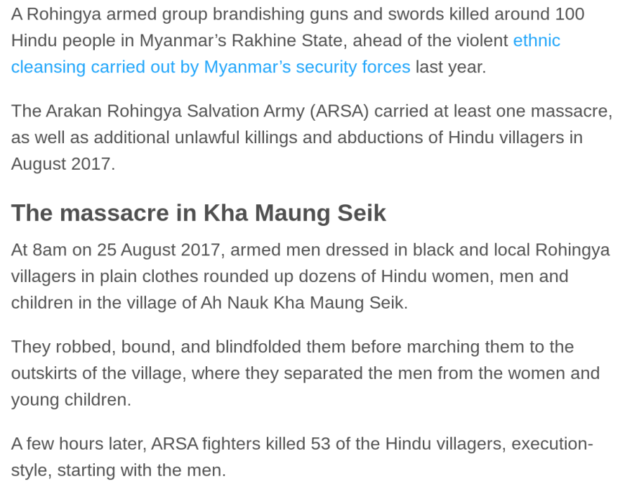 It is important to remember than Rohingyas have been responsible for multiple attacks and massacres of Hindus in Rakhine state of Myanmar. As per the Amnesty International, hundreds of Hindus were killed in such attacks.