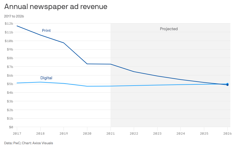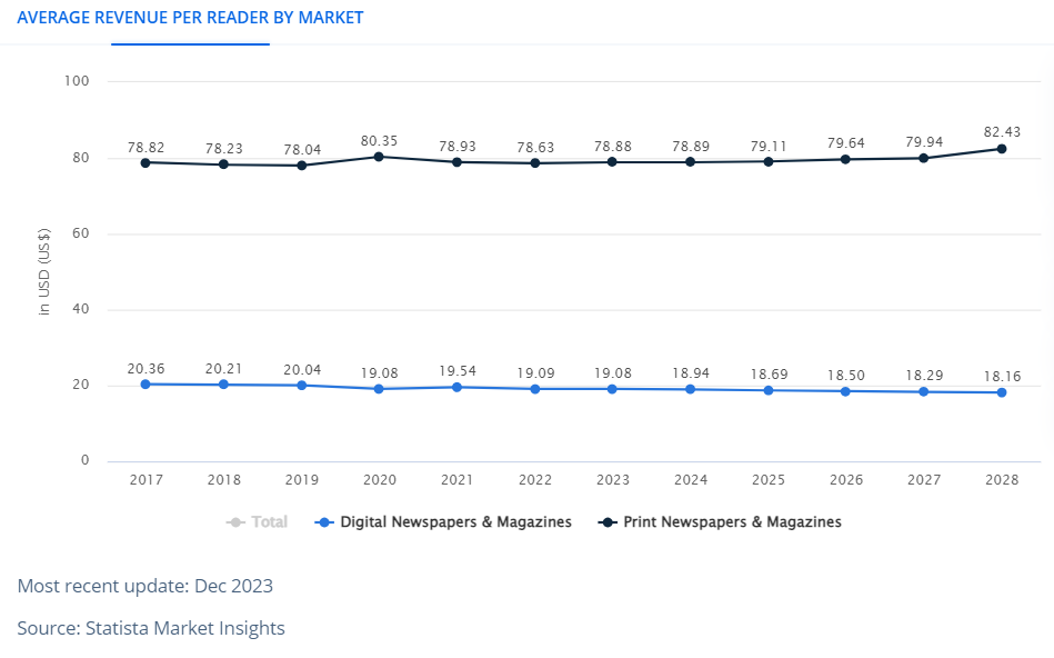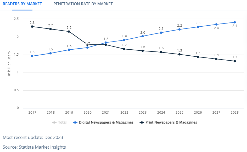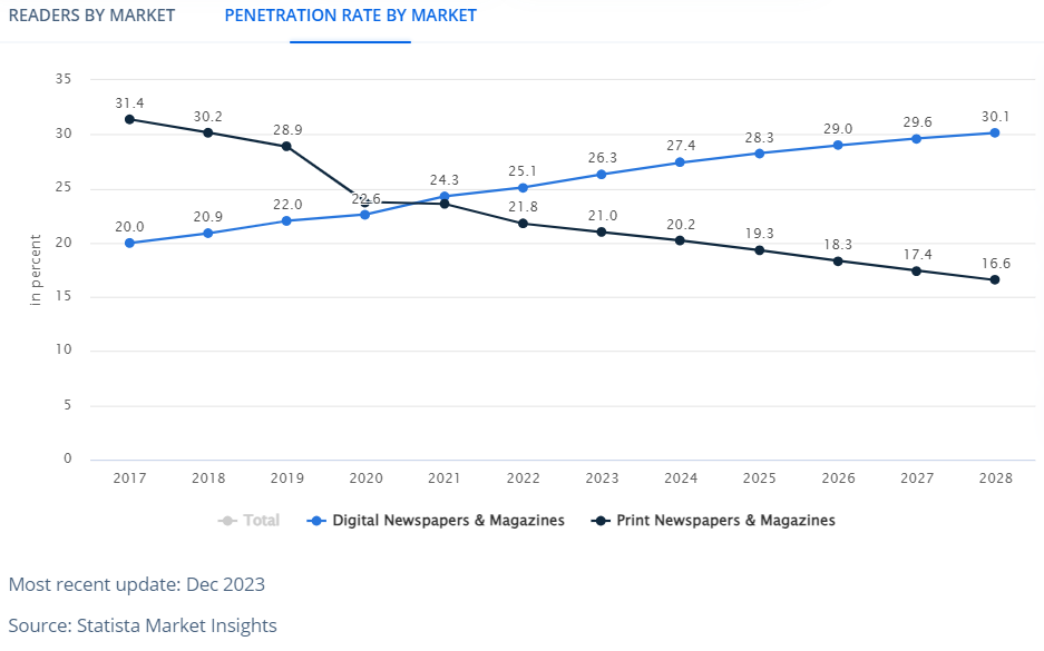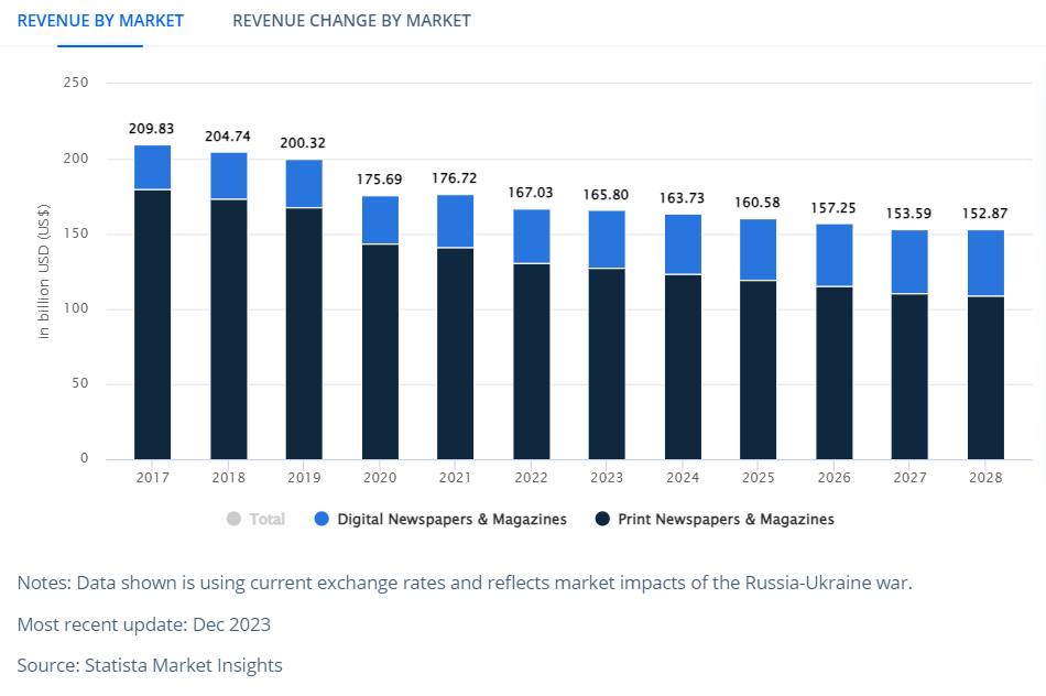 The global print newspapers & magazines market size was valued at USD 123.93 billion in 2021 and is expected to decline at a compound annual growth rate (CAGR) of -2.3% from 2022 to 2028. Newspapers and magazines have been gradually losing customers for years. (Source: "Print Newspapers & Magazines Market Report, 2028" / Grand View Research)