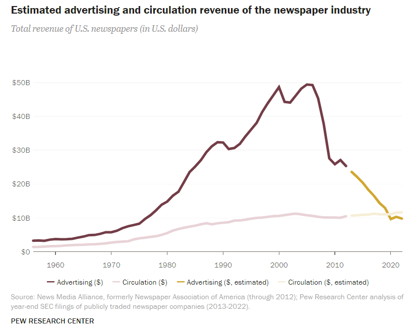 Over the years, advertising revenues and circulation have seen a decline after a brief high at the beginning of the century.