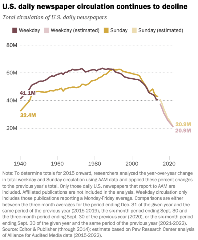 For the most part, daily newspaper circulation nationwide – counting digital subscriptions and print circulation – continues to decline, falling to just under 21 million in 2022, according to projections using data from the Alliance for Audited Media (AAM). Weekday circulation is down 8% from the previous year and 32% from five years prior, when it was over 30 million. Out of 136 papers included in this analysis, 120 experienced declines in weekday circulation in 2022 (Source: Audiences are declining for traditional news media in the U.S. – with some exceptions / Pew Research Center)