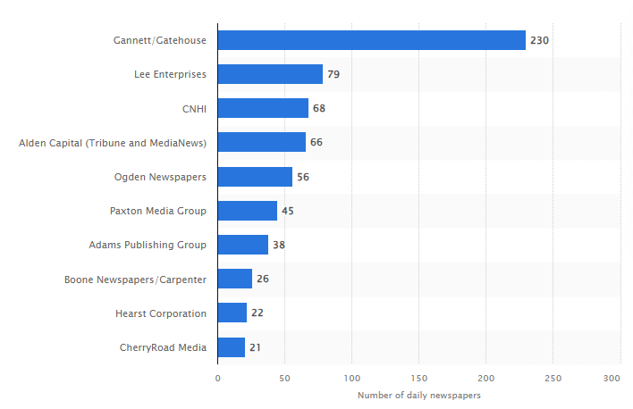 Alden Global Capital: As of November 2023, Alden owned more than 200 newspapers, including the Chicago Tribune, The Baltimore Sun, and the New York Daily News. Alden is the second-largest newspaper owner in the United States, after Gannett Co.