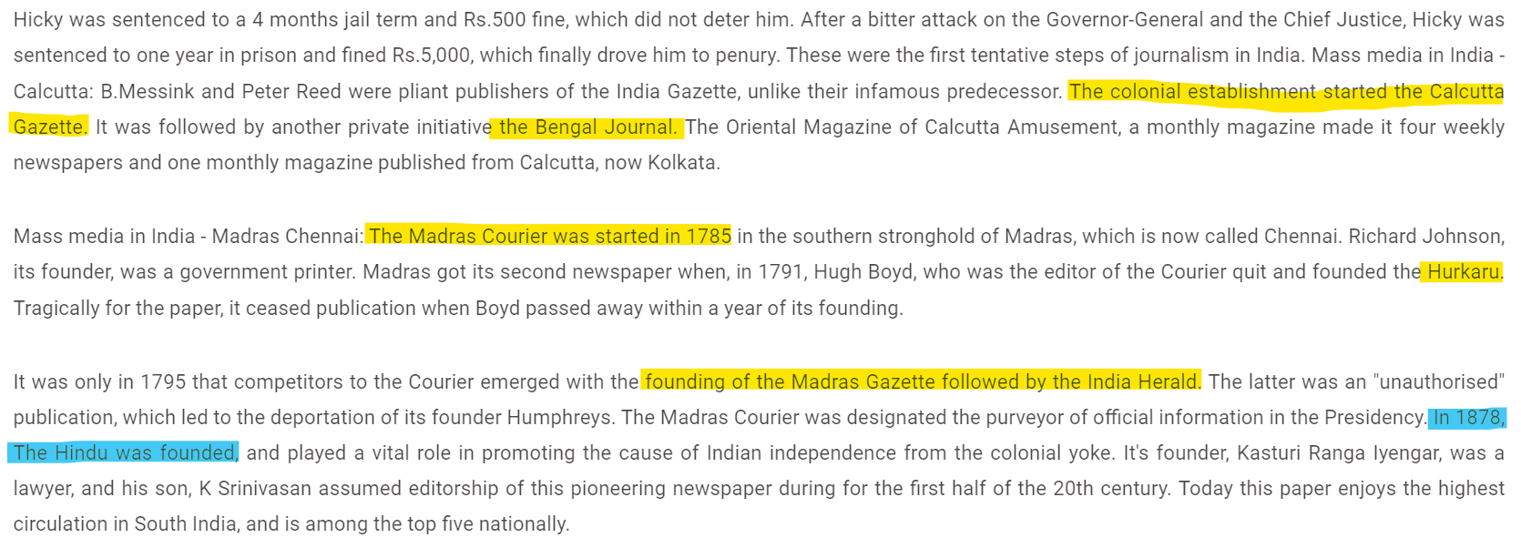 Other publications followed, such as The Bengal Journal, Calcutta Chronicle, Madras Courier, and Bombay Herald. Most of them were hit by censorship from the East India Company.